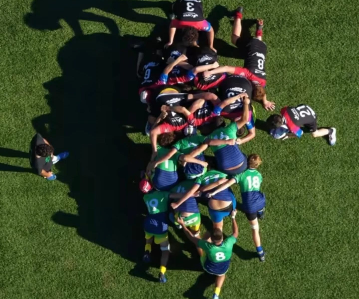 Les enfants  jouent les mêlées, les rucks et les regroupements ils sont dans la compétition Ils jouent à 15 avec les règles du rugby.